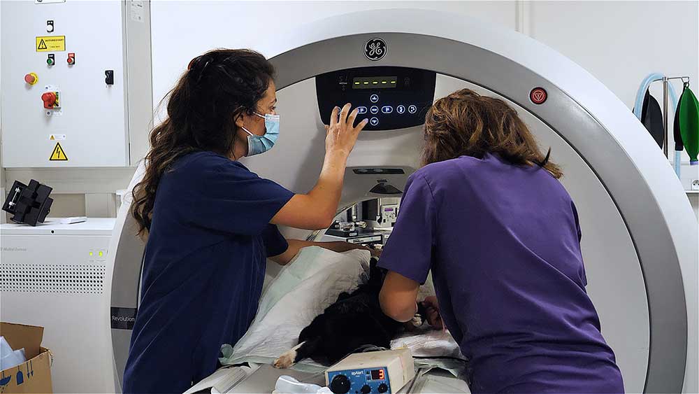 Il se réalise sous anesthésie générale afin d’éviter les mouvements. L’animal est placé au sein de la machine sur la table, positionné sur le dos ou sur le ventre en fonction de la zone à cibler.